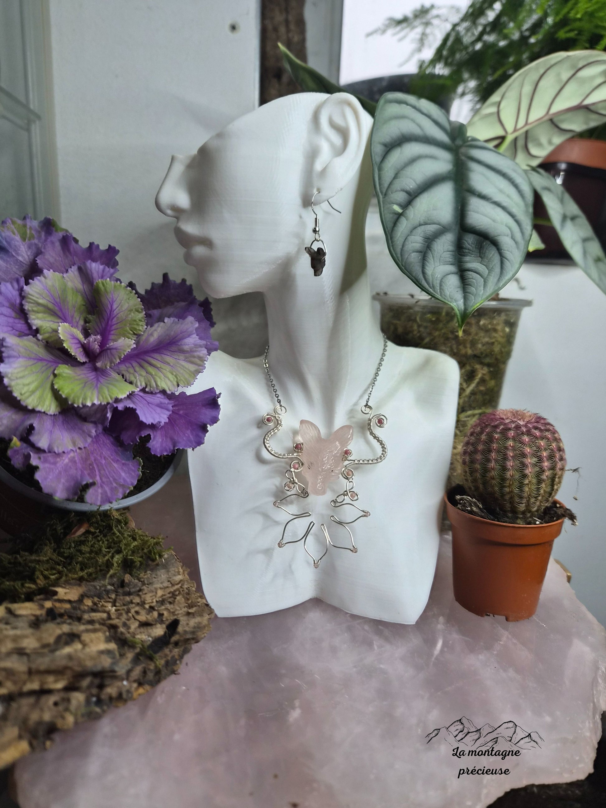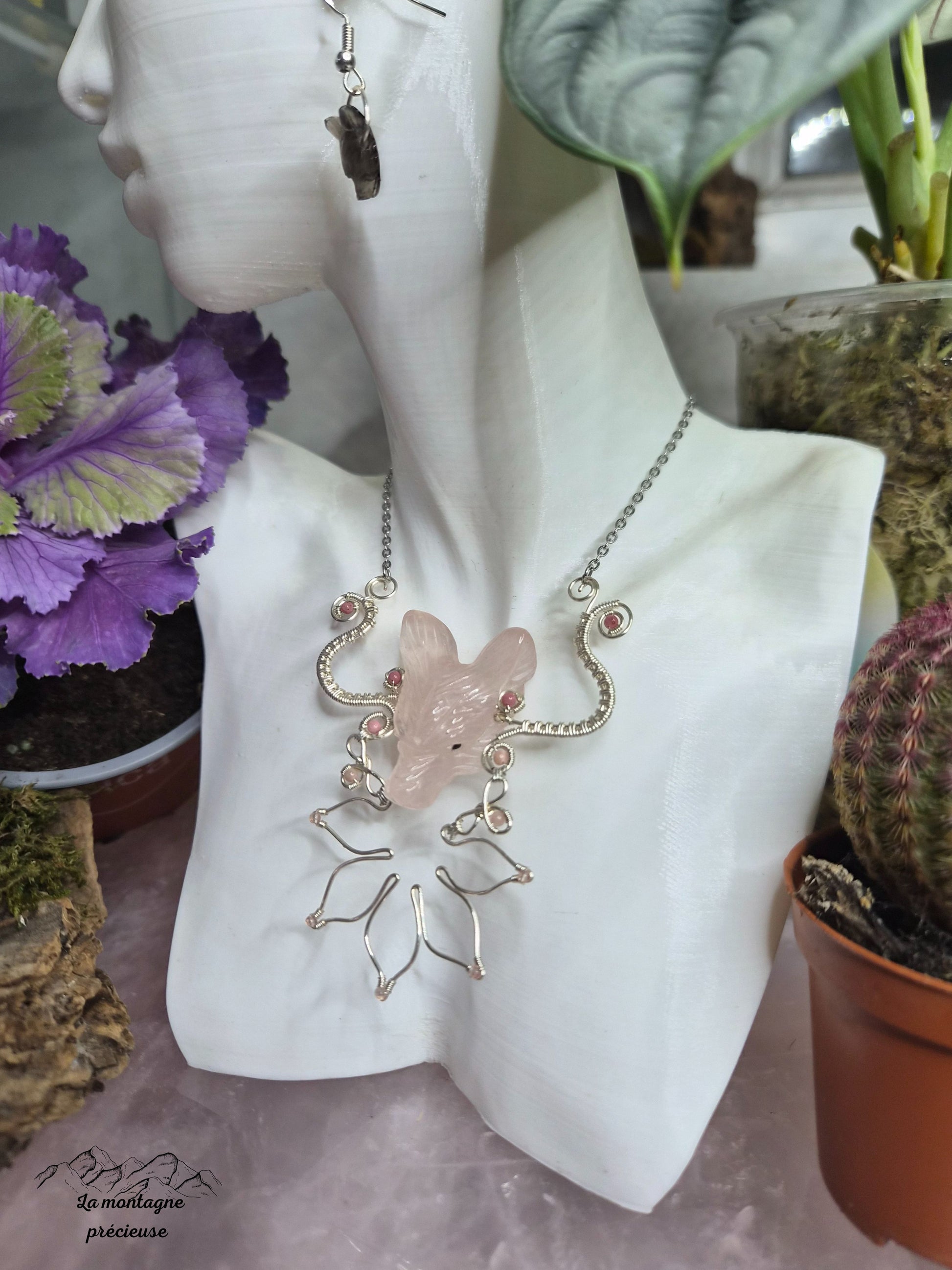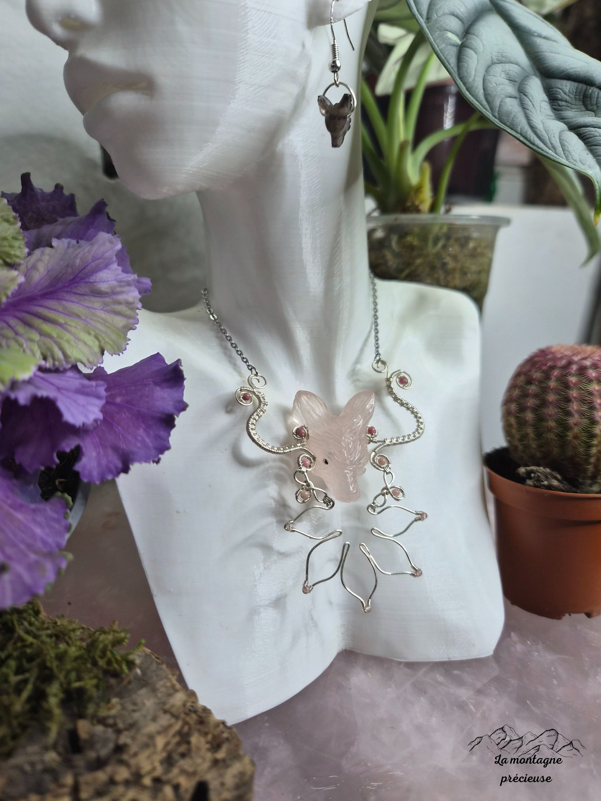Comme un souffle au cœur du printemps, ce bijoux dévoile un loup sculpté en quartz rose, pierre de douceur et d’amour.